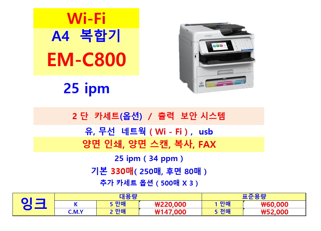 HOME > 전체상품 > 엡손 WorkForce Pro EM-C800 A4 컬러 잉크젯 복합기 잉크포함