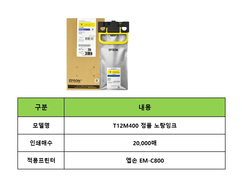 HOME > 전체상품 > 엡손 T12M400 대용량 노랑 정품잉크 EM-C800 20000매 T12M4