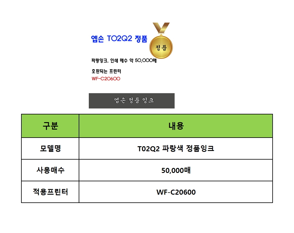 HOME > 전체상품 > 엡손 WF-C20600 대용량 정품잉크 파랑 T02Q2 5만매용