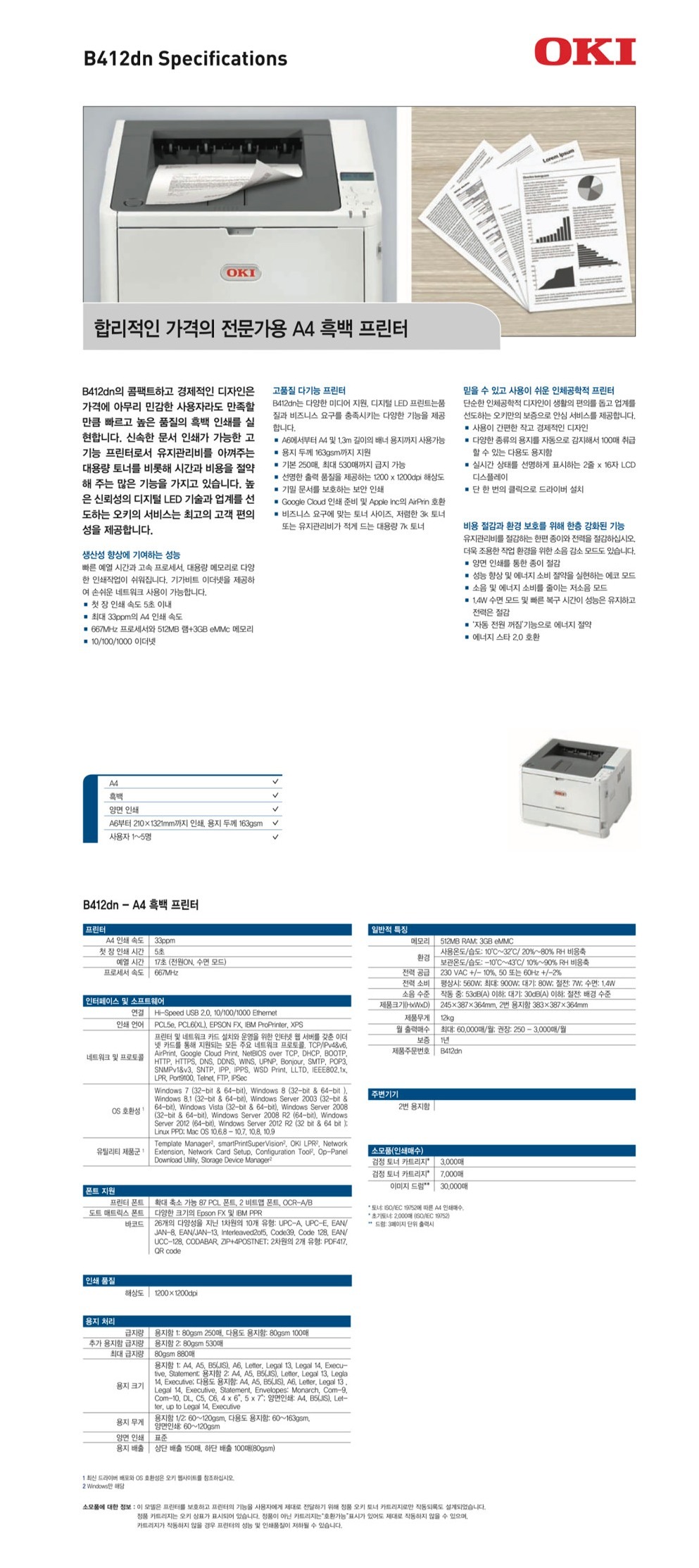 HOME > 전체상품 > OKI B412DN 흑백레이저프린터 양면인쇄 33 PPM 토너포함