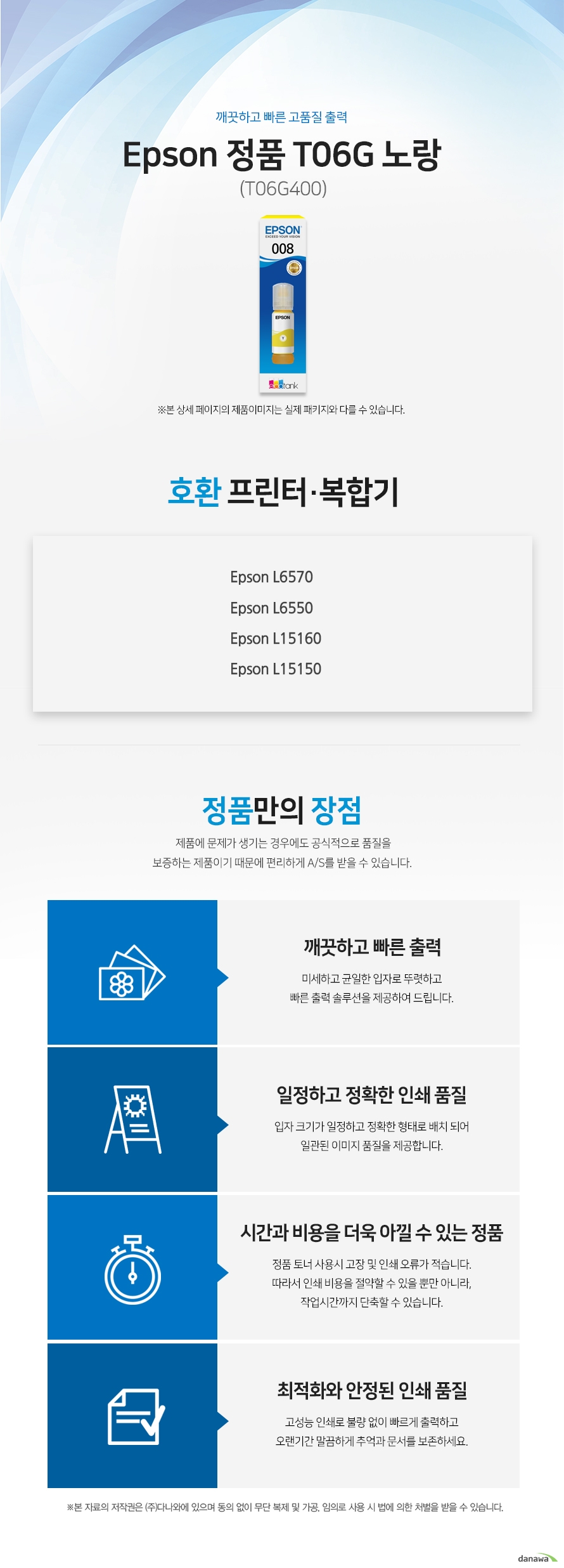 HOME > 전체상품 > 엡손 L15150 L15160 L6550 L6570 대용량 노랑잉크 T06G400 6K(008)