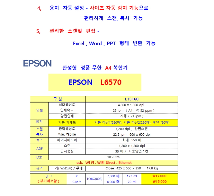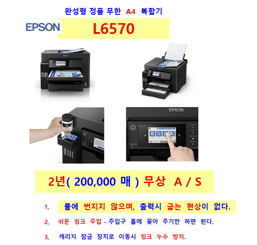 엡손 L6570 정품 무한잉크 A4 컬러 팩스 복합기 기본잉크 포함